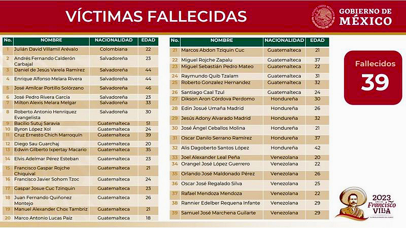 Rosa Icela Rodríguez, secretaria de Seguridad Pública y Protección Ciudadana, detalló en una rueda de prensa que de las víctimas mortales, 18 eran de Guatemala, siete de Venezuela, siete de El Salvador, seis de Honduras y uno de Colombia. Todos de sexo masculino y tenían entre 18 y 51 años.