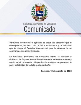Por último, reiteró su llamado al Gobierno de Guyana a «cesar inmediatamente estas operaciones y a retomar el camino del diálogo directo a efectos de preservar la paz y estabilidad de toda la región caribeña».