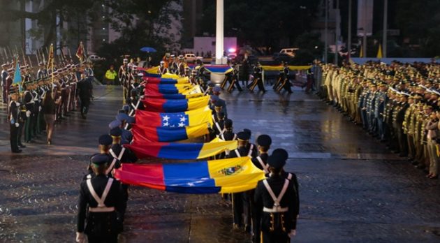 En el acto, los cadetes de la Fuerza Armada Nacional desplegaron todas las banderas que Venezuela ha tenido a lo largo de su historia, detalla Mundo UR.