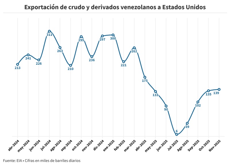 En promedio, en los 11 primeros meses de 2025, Venezuela ha vendido a Estados Unidos 145.600 bpd por mes de petróleo y productos, lo que representa una caída de 35% en comparación con el mismo lapso de 2024.