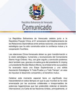 Mediante un comunicado publicado por el ministro del Poder Popular para Relaciones Exteriores, Yván Gil, en su canal de Telegram, se destaca que las relaciones entre Venezuela y China deben su gran transformación a la visión estratégica y humanista del comandante Hugo Chávez, indica la nota de Últimas Noticias.