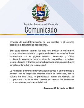 “Con gran orgullo y convicción podemos decir también que, gracias a la sabia guía del presidente Xi Jinping y el presidente Nicolás Maduro Moros, la amistad entre sus pueblos ha avanzado hacía una Etapa Esplendorosa y una sólida Asociación Estratégica ‘A Toda Prueba y a Todo Tiempo’, en aras de impulsar el desarrollo compartido y el beneficio mutuo”.